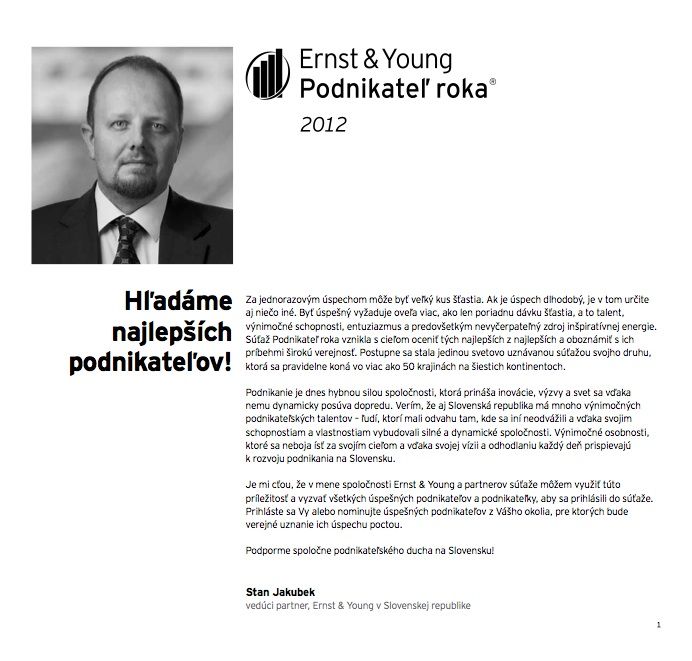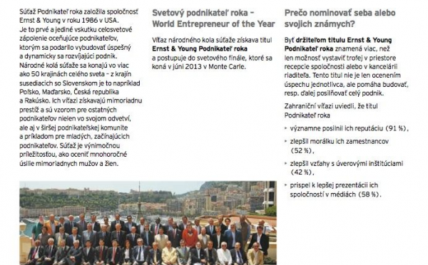 Aj tento rok sme mali príležitosť spolupracovať na projekte svetovej súťaže EY Podnikateľ roka vrámci Slovenska a Českej republiky.